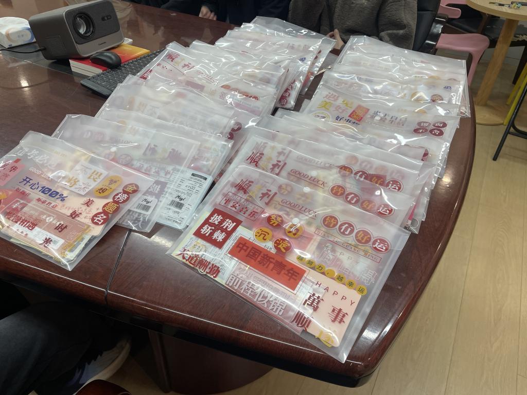 为助力考研学子全力冲刺、圆梦考场,学院精心筹备的"考研加油包"满载温情。礼包中包含学院领导班子、系室主任、教工党支部书记、辅导员及学弟学妹们亲手书写的祝福贺卡;“天道酬勤”励志书签,以隽永文字时刻勉励追梦人;甜蜜糖果,将“金榜题名”的美好祝福融进舌尖;舒缓眼贴,为疲惫的眼眸送上片刻放松;还有刻着“前程似锦”字样的定制钥匙扣,寓意开启通往理想学府的大门。从精神慰藉到实用助力,这份礼包全方位为考研学子保驾护航。
